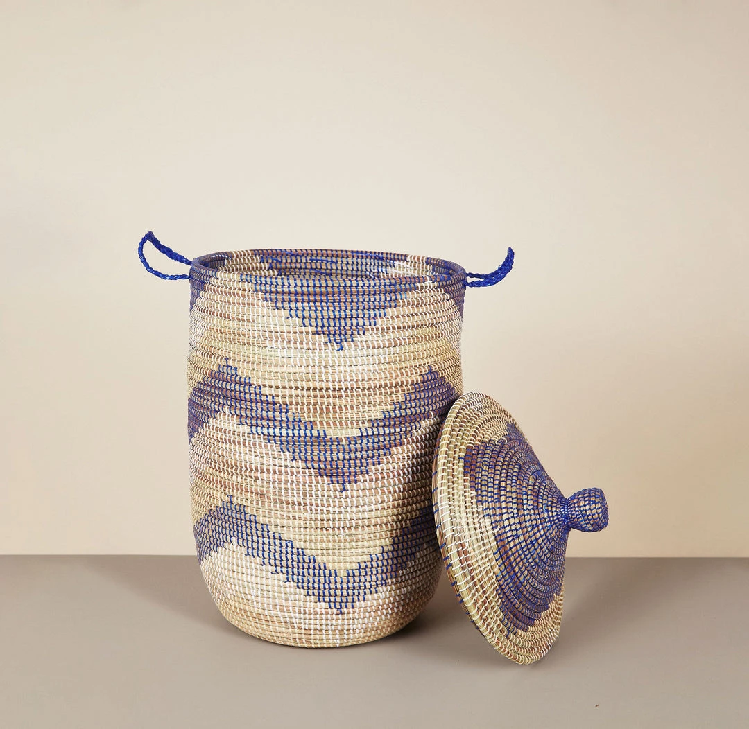 Wolof craftswomen in Senegal weave these beautiful and functional large hampers from millet grass and recycled plastic. This African basket features a bold pattern that will add a pop of color to any room. Large enough to be storage solution for towels or laundry, and stylish enough to be a focal point to any space.
