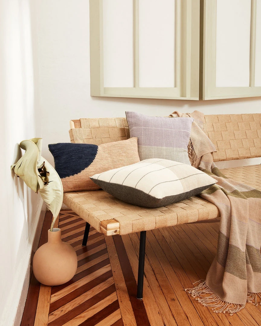 The Anni Pillow was inspired by the work of artist Anni Albers. The understated design can easily be incorporated into any room. Layer on the couch or bed. Woven out of super-soft alpaca by a weaving co-op near La Paz, Bolivia. The backside is a solid woven dark gray to create a playful color contrast. Due to the nature of handcrafted goods, each pillow may differ slightly.