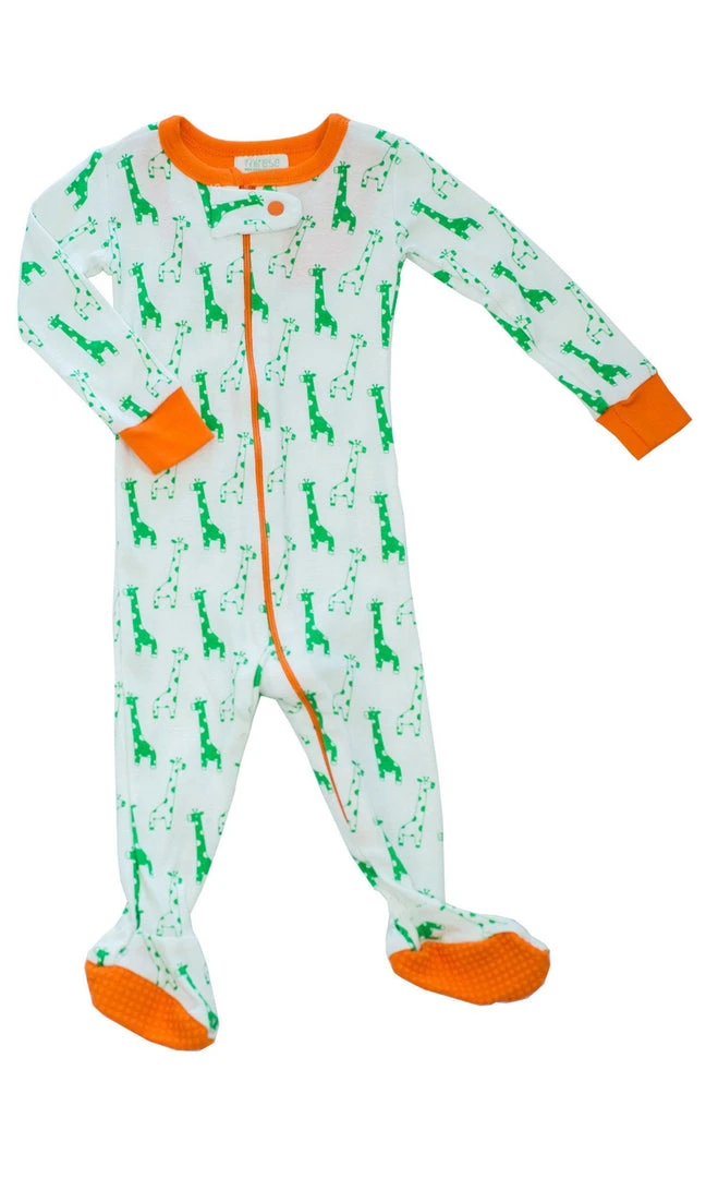 This easy zip-up footed onesies was designed with a dash of adventure. Orange accents in the cuffs, neck, zipper and feet. Grippy feet make exploration safe and fun while the soft organic cotton adds ultra comfort.