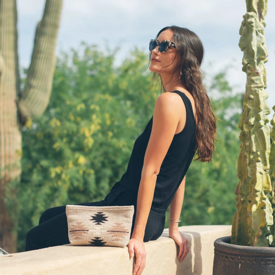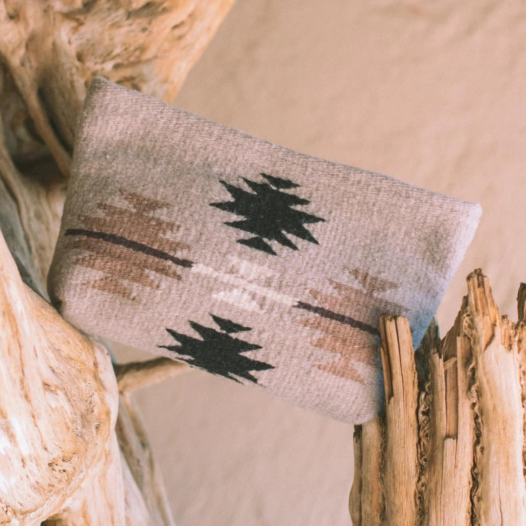 The Gemstone pattern features a Zapotec diamond design in shades of beige, onyx, dusty mauve, eggplant, and cream. This earthy color palette will easily transition from season to season, perfect for a clutch lovingly handmade to last.