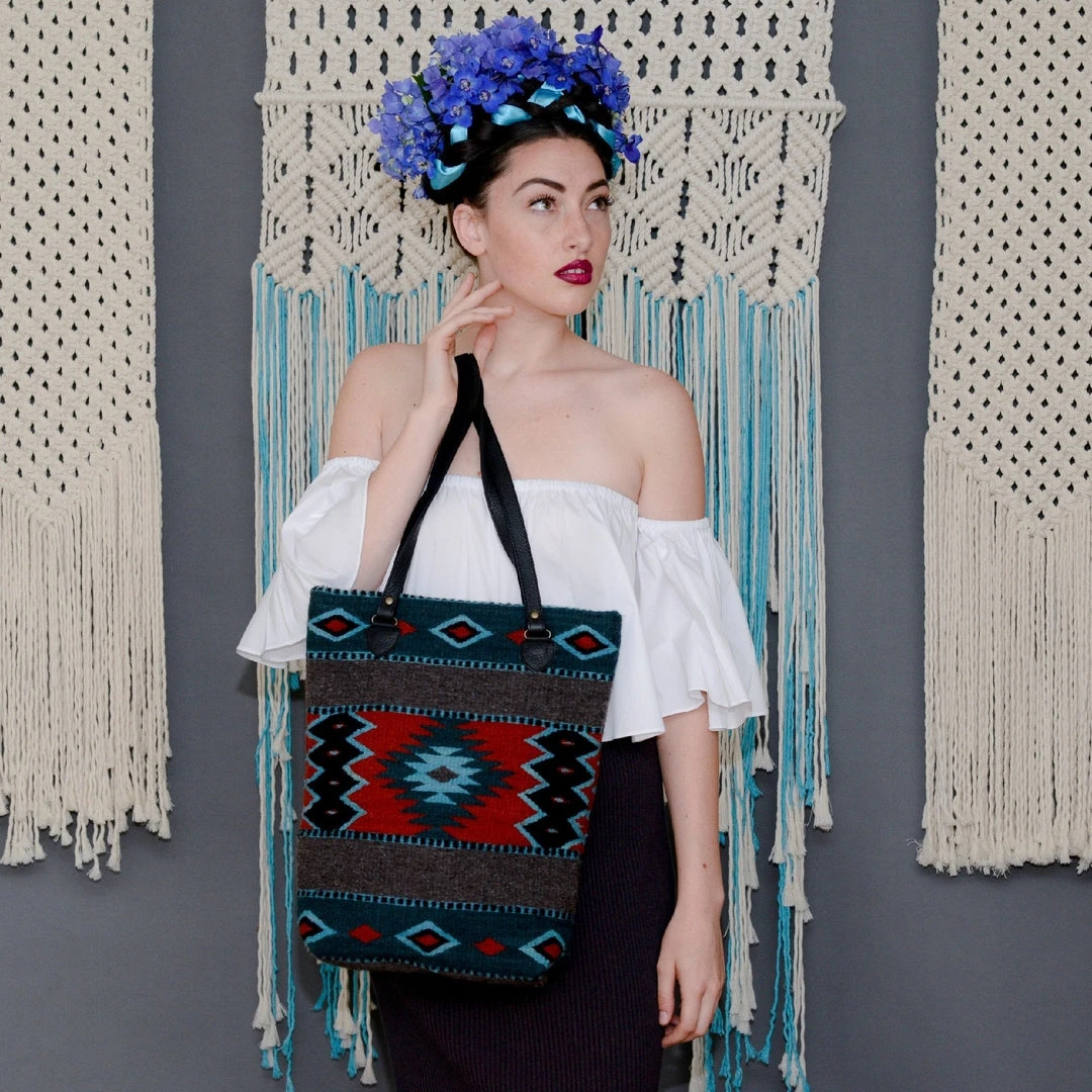 The Lost Island pattern features Zapotec diamond designs in turquoise, navy and red on gray wool.