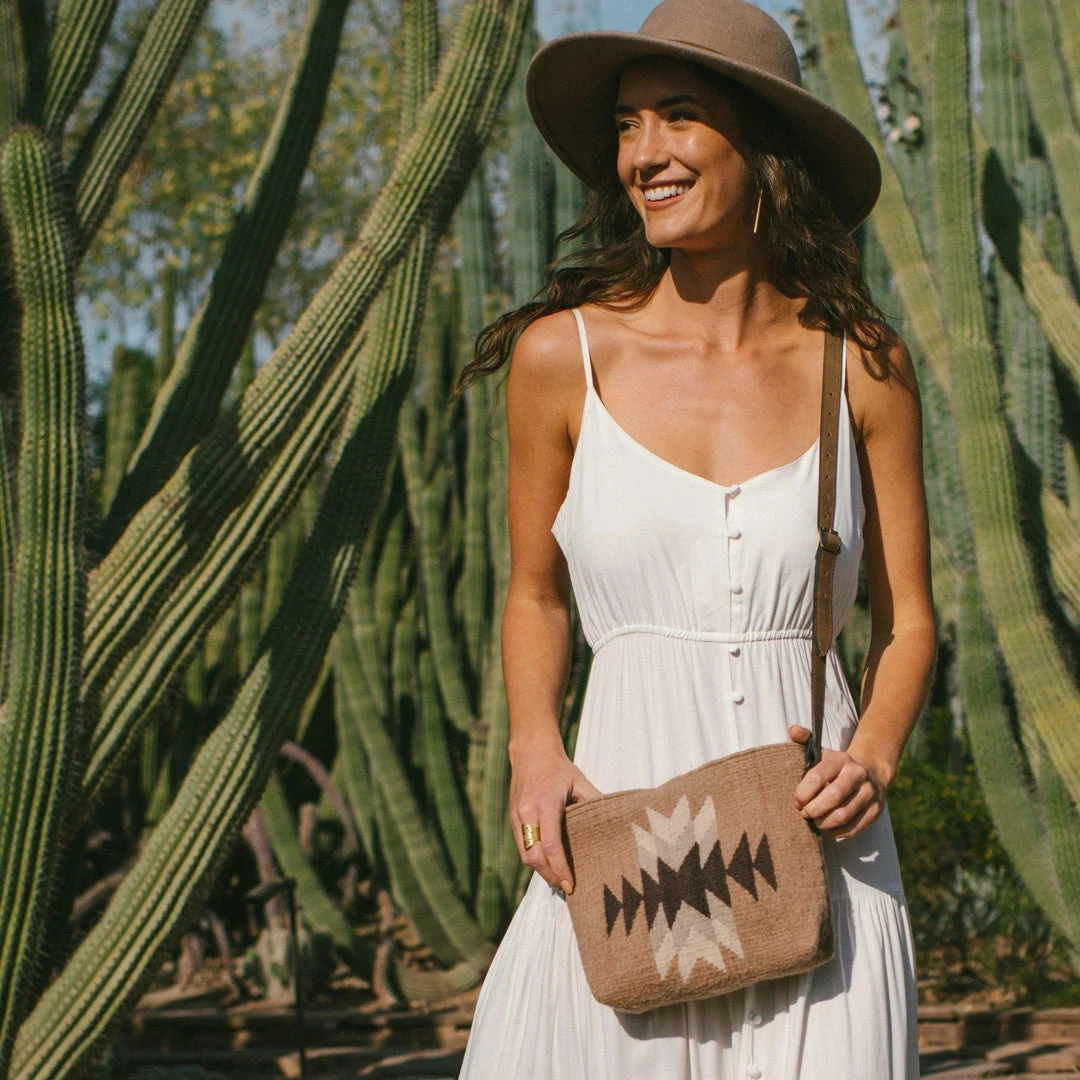 The Tule pattern features an abstract Zapotec lightning design in shades of dusty mauve, beige, cream, and rich chocolate brown. This earthy color palette will easily transition from season to season, perfect for a crossbody purse lovingly handmade to last.