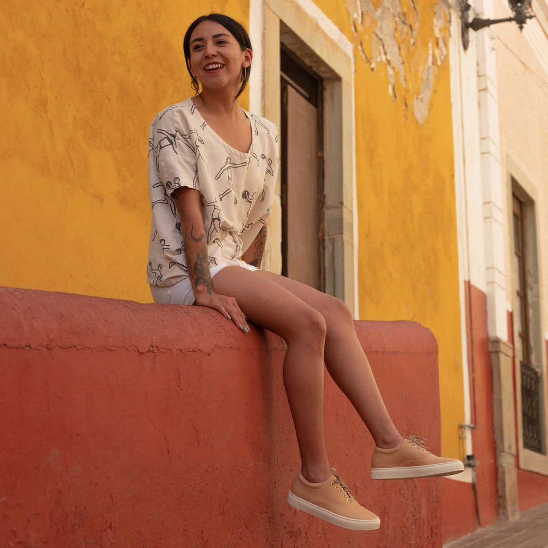 An elevated take on a classic sneaker style, the Elayna Leather Sneaker is handmade in León, Mexico and features a Vibram sole, rose gold eyelets, and waxed cotton laces.