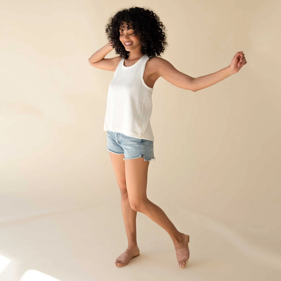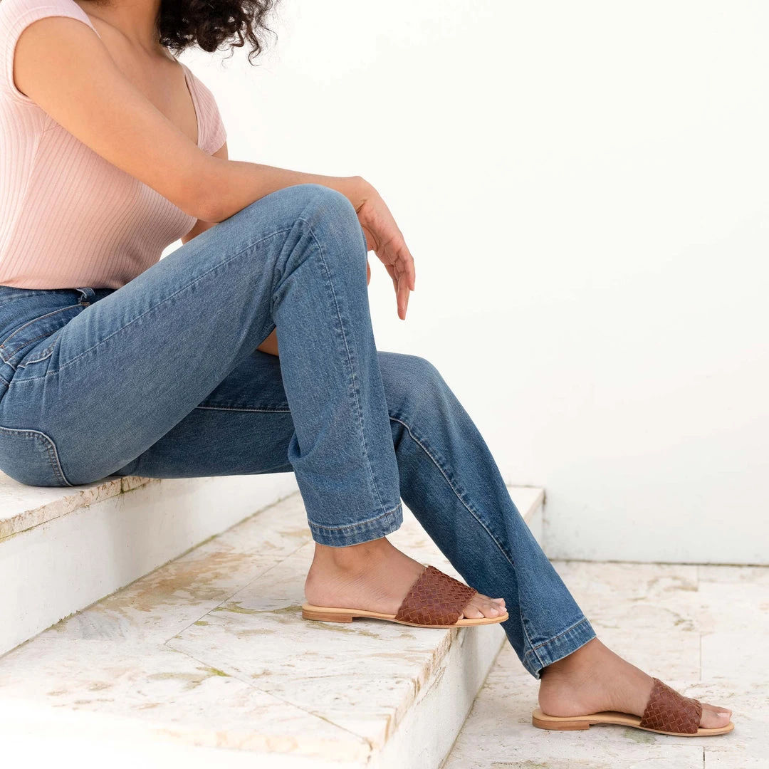An elegant slip-on. Minimal, versatile, handwoven, and designed to elevate your warm weather wardrobe with a touch of artisanal texture added to your everyday. Intentionally designed with a 2.75” leather strap, rubber heel cap, and waterproof leather upper for added functionality—not to mention slip on/off convenience for easy, on-the-go, effortless elegance.