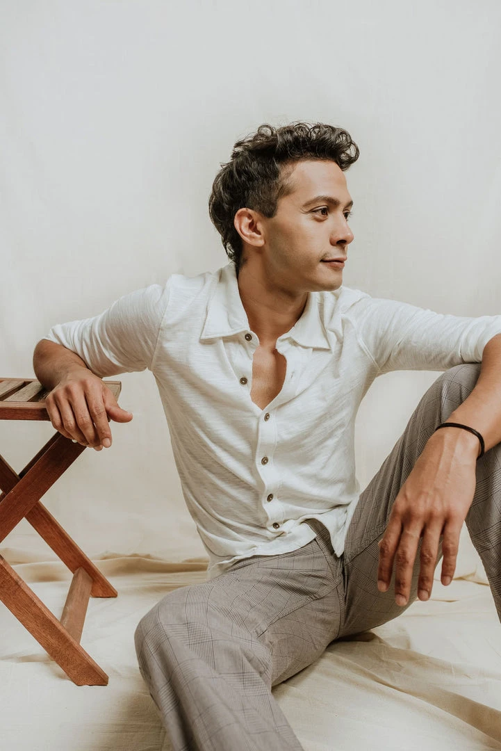 This knitted fabric allows for some stretch and a more casual feel. It’s exceptionally comfortable and looks great with sleeves rolled up, worn with chinos or shorts. Cut in a slim fit and minimally detailed with coconut shell buttons and a wide collar.