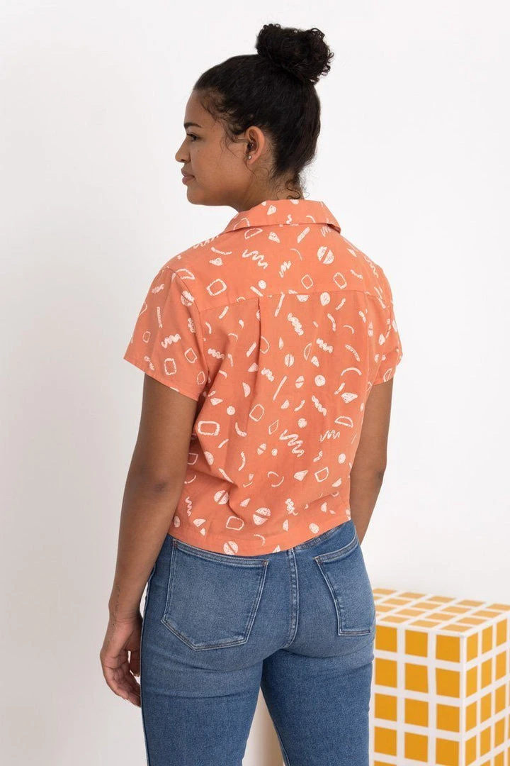 The Rizo top features a double collar, a pocket on the front, an off-the-body fit, and a cute cropped length. Made in small productions. Wear if with the Alex Pant.