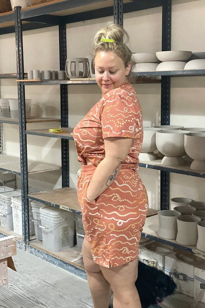 The Taylor tee is the perfect length for tucking, tying and layering. Made from organic cotton 7oz jersey, custom printed and pre-shrunk.