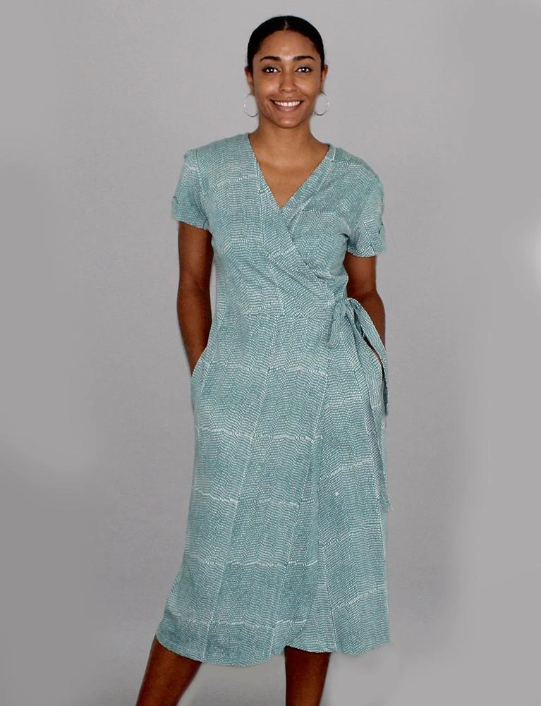 This full-length wrap dress is made of soft and breathable organic jersey cotton and features short-sleeves and side pockets. Your purchase helps provide a secure job with fair wages and a positive working environment for artisans in India and the United States.
