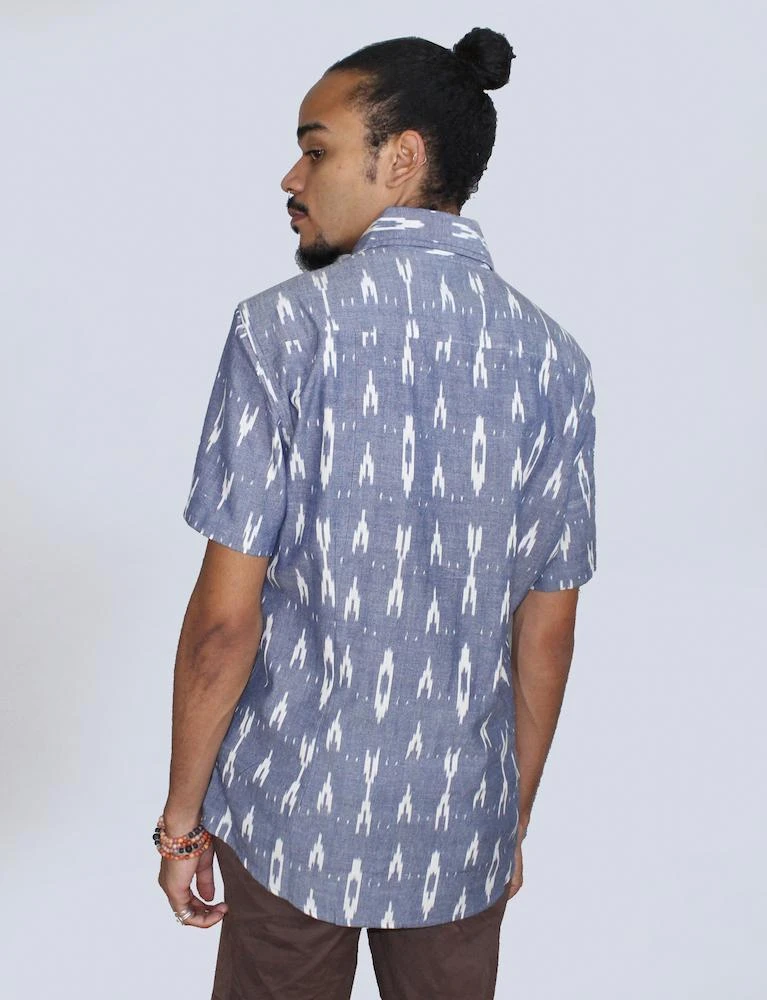 This short sleeve men’s button down shirt features a light blue geometric print. Gentle tapering at the waist with a straight and narrow profile and a broader fit in the shoulders gives this shirt the perfect fit. Due to the handmade nature of this item, slight color variation may occur.