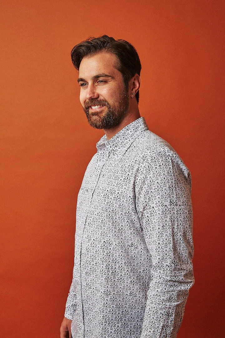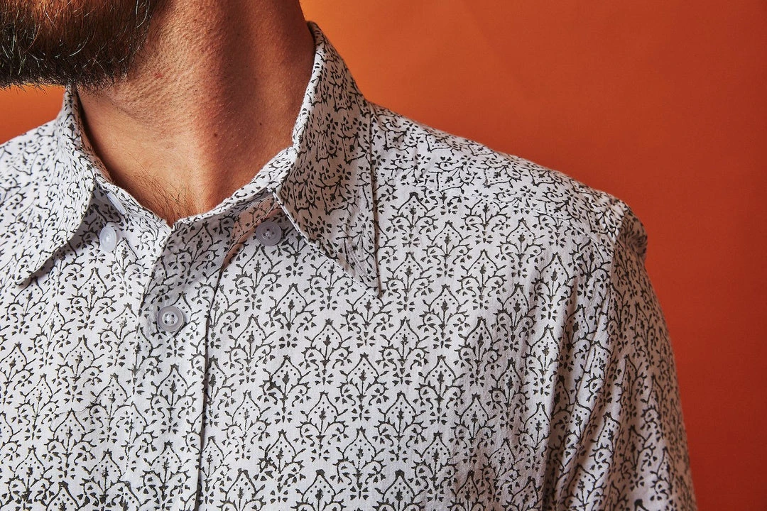 This shirt is beautifully printed with eco dyes in a black and white floral. Gentle tapering at the waist with a straight and narrow profile and a broader fit in the shoulders makes this shirt perfect for a night out or even to work the next day.