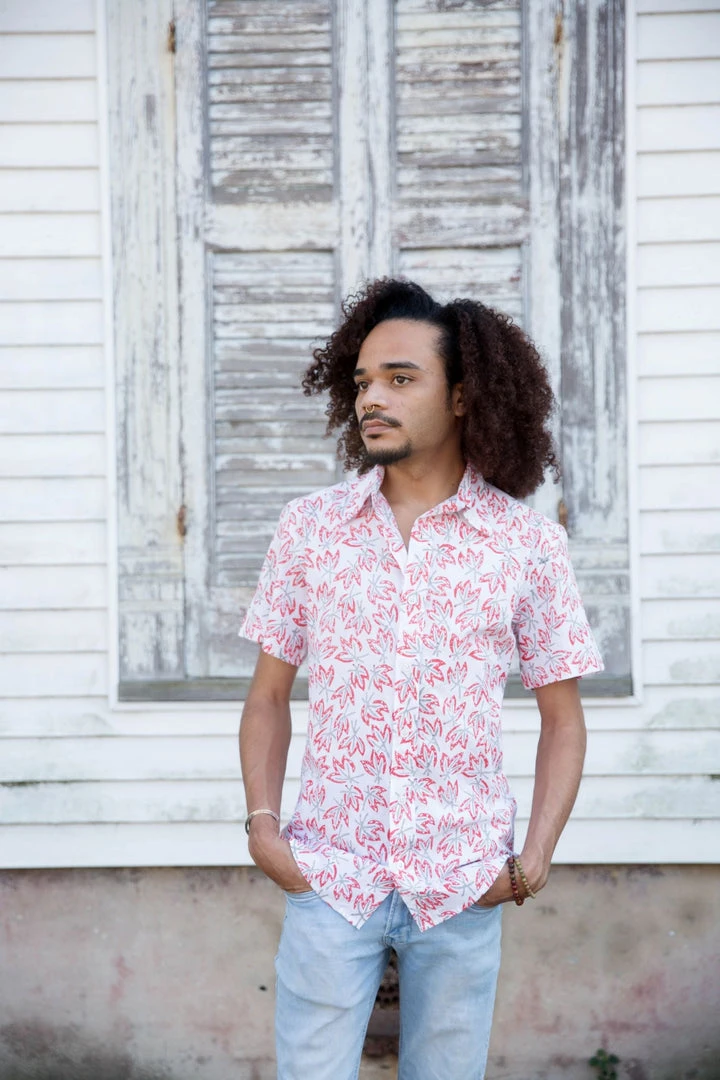 This short sleeve button down features a hand block printed tropical floral print. Gentle tapering at the waist with a straight and narrow profile and a broader fit in the shoulders gives this shirt the perfect fit. Dress this shirt up with slacks for dinner dates or pair with jeans for a polished casual look. Due to the handmade nature of this item, slight color variation may occur.