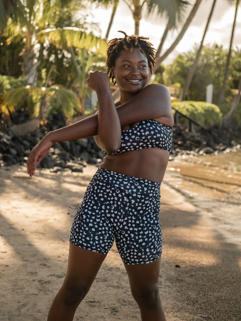 The Kali Recycled Bike Shorts are cute and functional with dual pockets and a high rise. These shorts are super lightweight, extremely soft and will keep up with you in and out of the water.