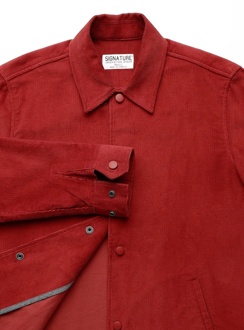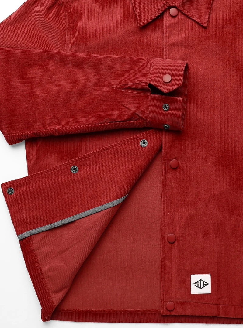 This corduroy jacket is a lightweight piece that’s perfect for layering. The cuffs feature an arrow-cut design that compliments the eye catching, color-matching snaps. The outside has two flat laying welt pockets. The inside seams have been finished and closed with chambray trim. Throw it on over jeans and a tee to create an elevated look.