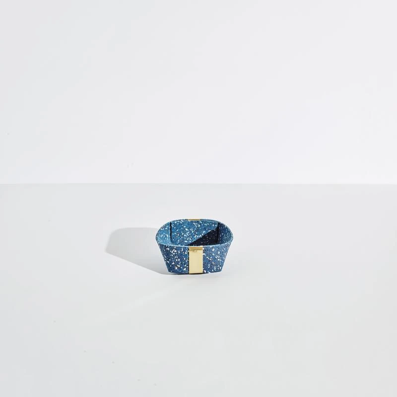 Set of three recycled rubber catch-alls with brass detailing, perfect for odds and ends around the house. Baskets nest into one another.