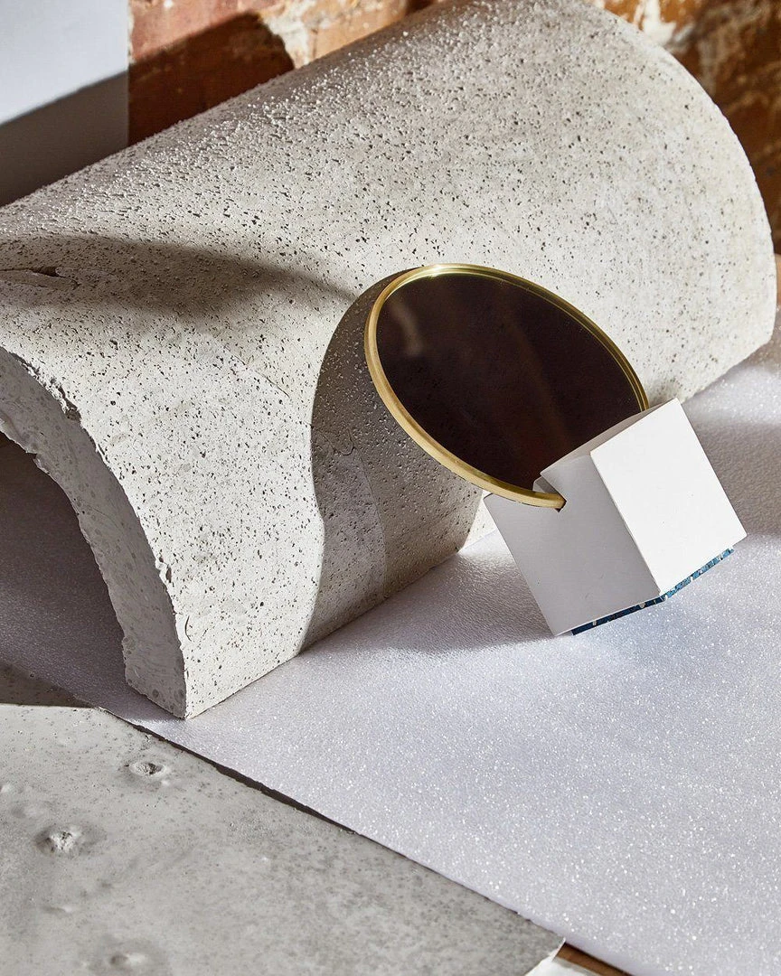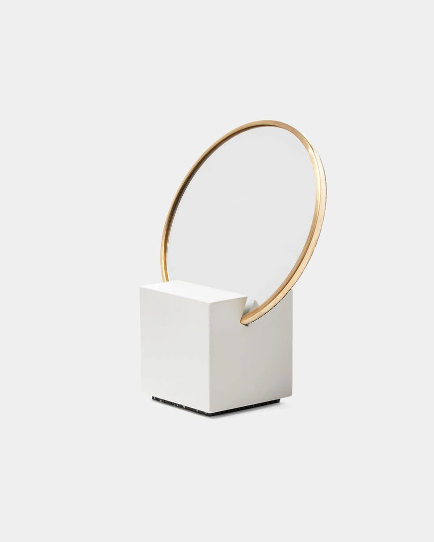 Cube base with 6″ round mirror, brass edges and rubber backing. The perfect addition to your desk or vanity. Packed and shipped in a protective box ready for gifting.