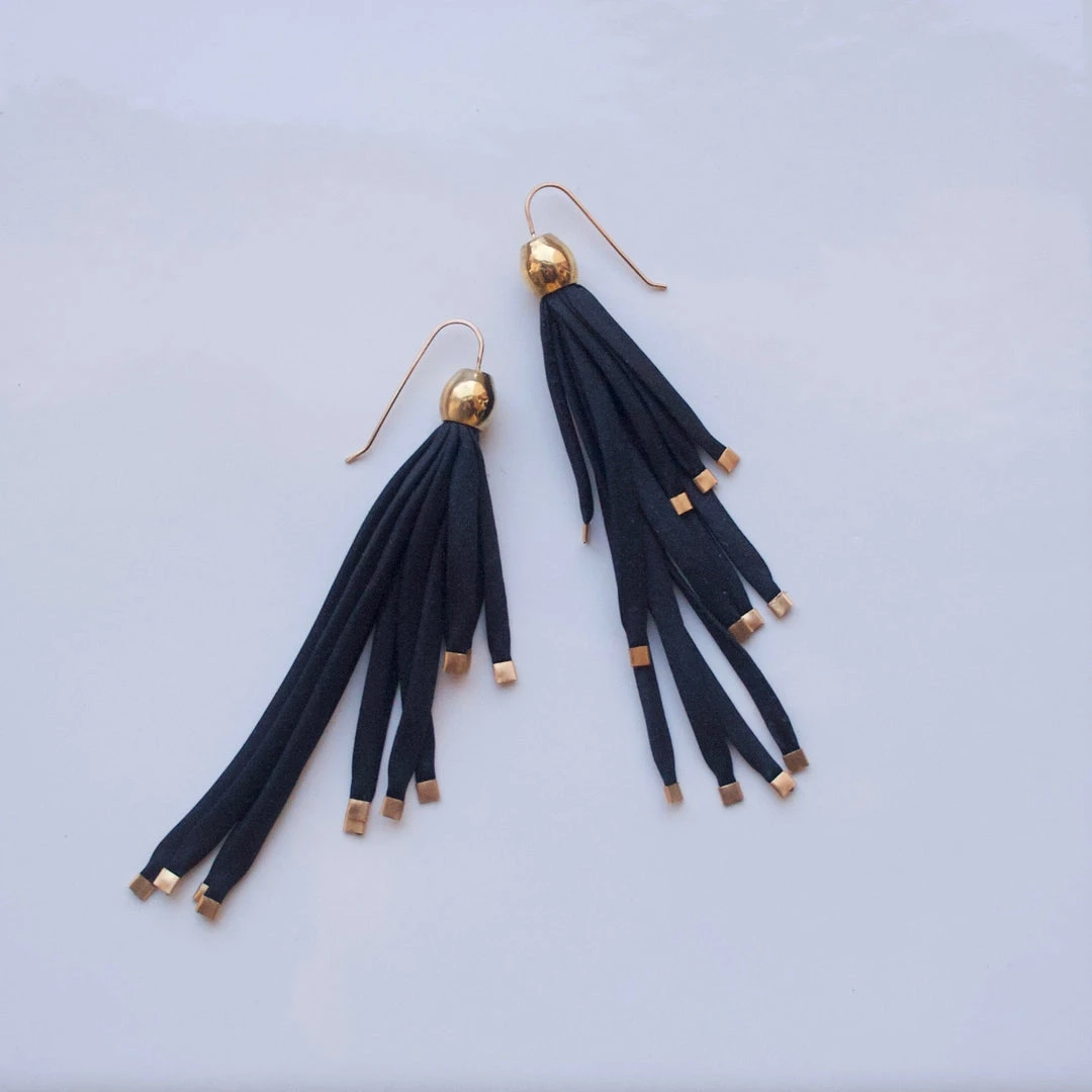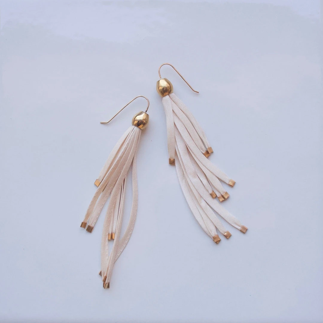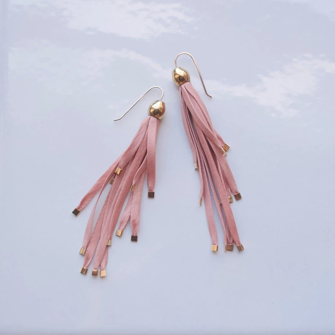 The Seafall Earrings feature metal pods with botanically dyed silk strands, then finished with gilded tips. The silk strands create swaying movement, making for a delicate statement earring. Each pair is expertly handcrafted in the California Bay Area. Due to the hand dyed nature of the jewelry slight variations in color are to be expected.