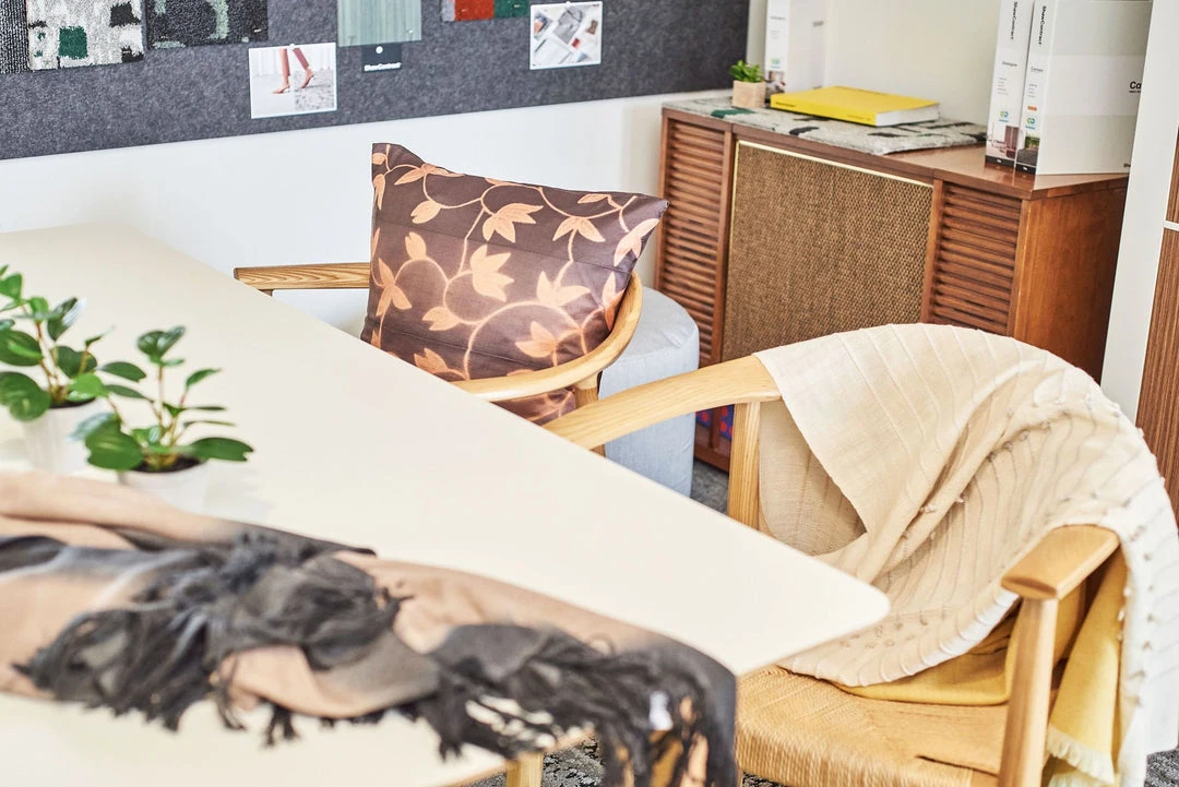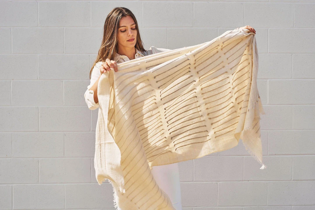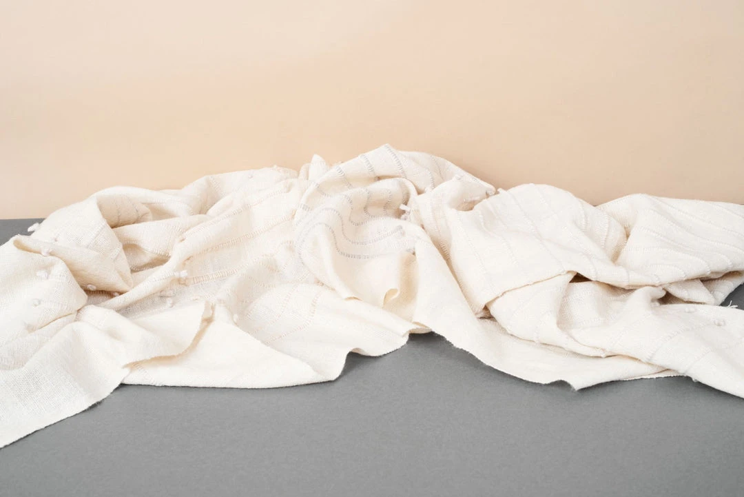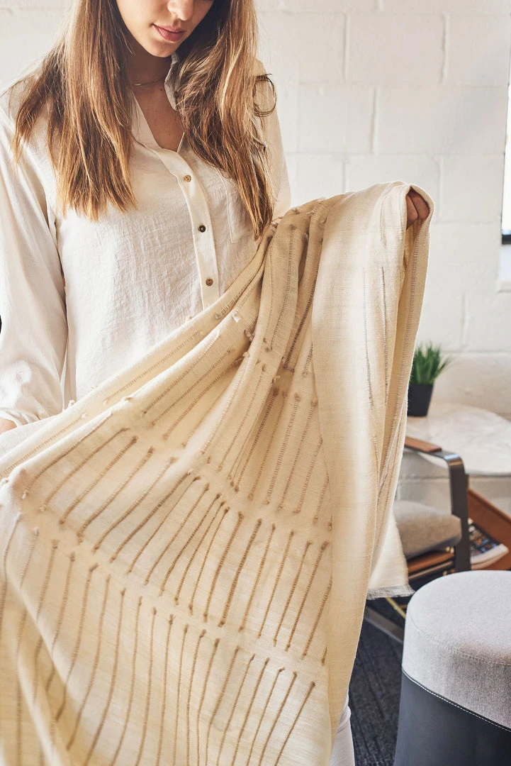 This throw is made up of subtly textured stripes, creating a soft, neutral gradient effect. The edge of each stripe pattern is hand-knotted on one side, and the edges on the reverse side are kept clean, making this throw reversible and versatile to arrange and use.