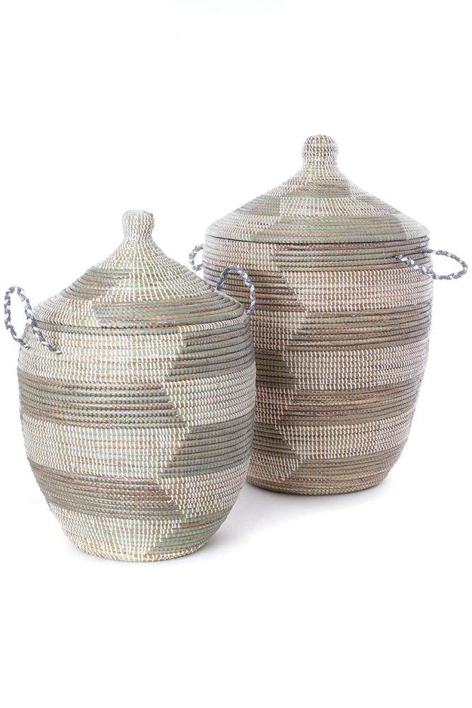 African laundry hampers bring amazing artisan craftsmanship into our living spaces. Our laundry hampers are handwoven by an association of more than 100 rural Wolof women in the West African nation of Senegal. Swahili helps extend the women’s reach far beyond their saturated local markets to homes across America. These handcrafted baskets may vary slightly as compared to the the photos, as each set is unique.