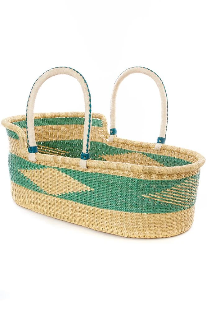 Ghanaian basket weavers handcraft this beautiful baby bassinet basket from stiff stalks of elephant grass. Dyed seafoam blue-green strands add a touch of soft color to the natural grass. Leather handles with a decorative contrasting braid offer added comfort. Because this is a handcrafted item, each may vary slightly.