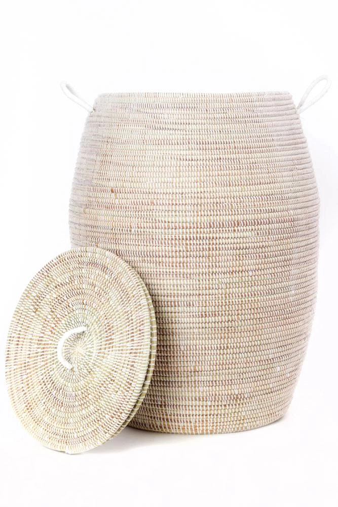 These laundry hampers are handwoven by more than 100 rural Wolof women. Crafting baskets allows women to earn income from the comfort of their community. Using abundant and renewable cattail stalks bound with salvaged plastic strips procured from a local mat factory, the women hand-weave each of these hampers. These handcrafted baskets may vary slightly as compared to the the photos, as each set is unique.