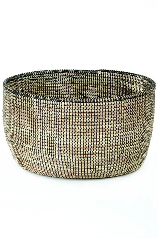 Swahili African Modern’s baskets and hampers are hand-woven by the Wolof women of Senegal who are traditional, artisan basket weavers. Each basket and hamper is made with natural cattails and reeds, accented by colorful strips of plastic from used prayer mats.