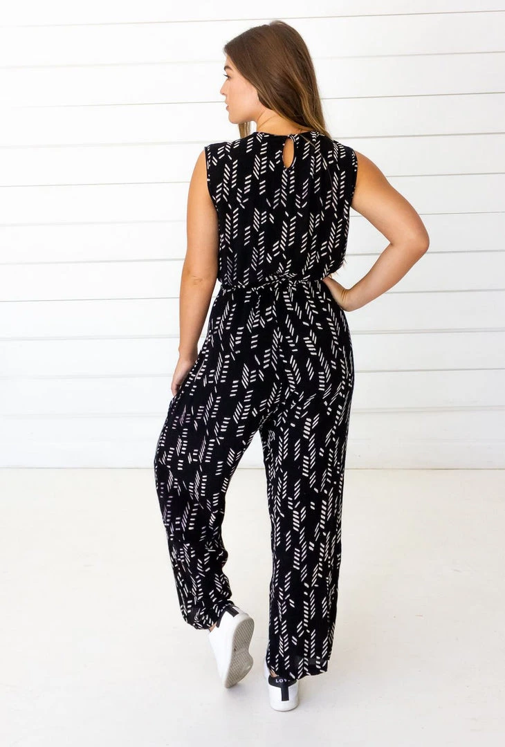 This jumpsuit includes an adjustable tie at the natural waist, a breast snap closure, and a back button closure for premium comfort. Their stylized feather print signifies honor and courage. Handmade by women artisans in India.