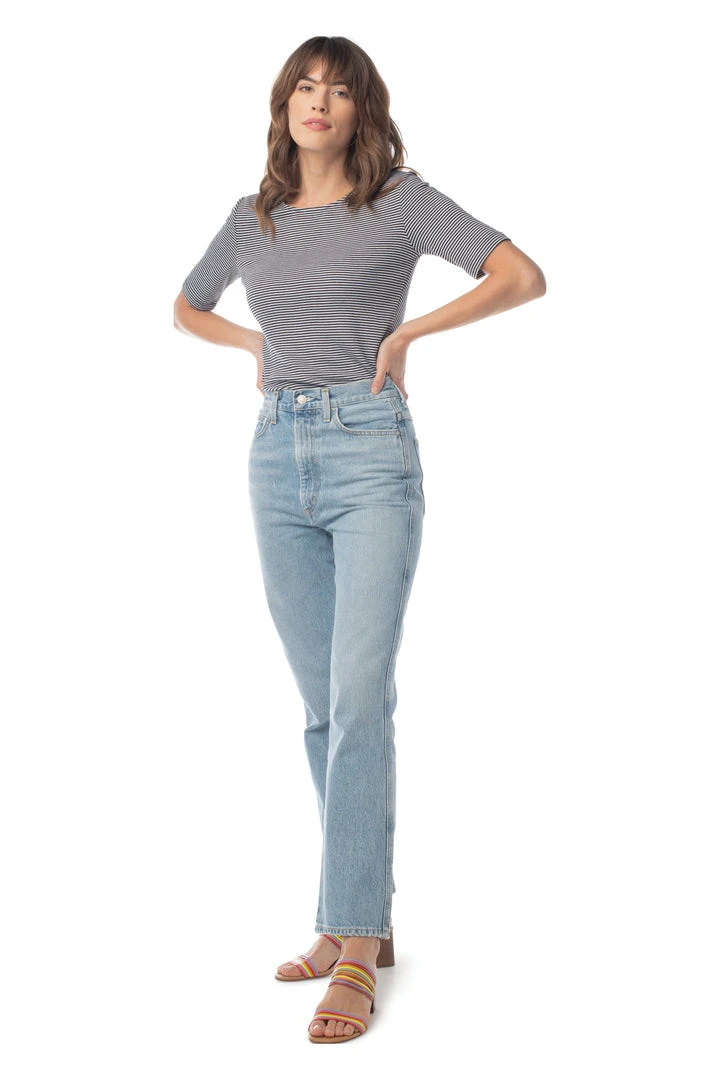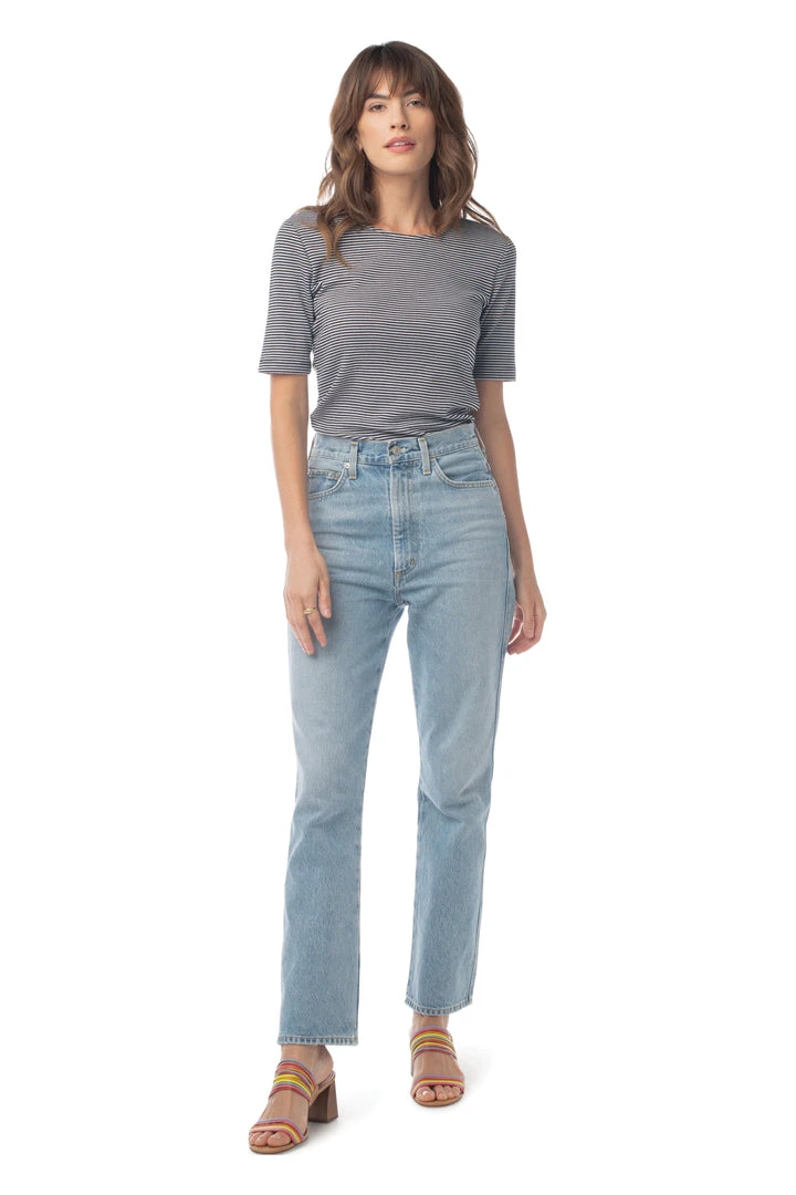 In a subtle striped fabric, the column tee has a high neck and 3/4 inch sleeve for more coverage.