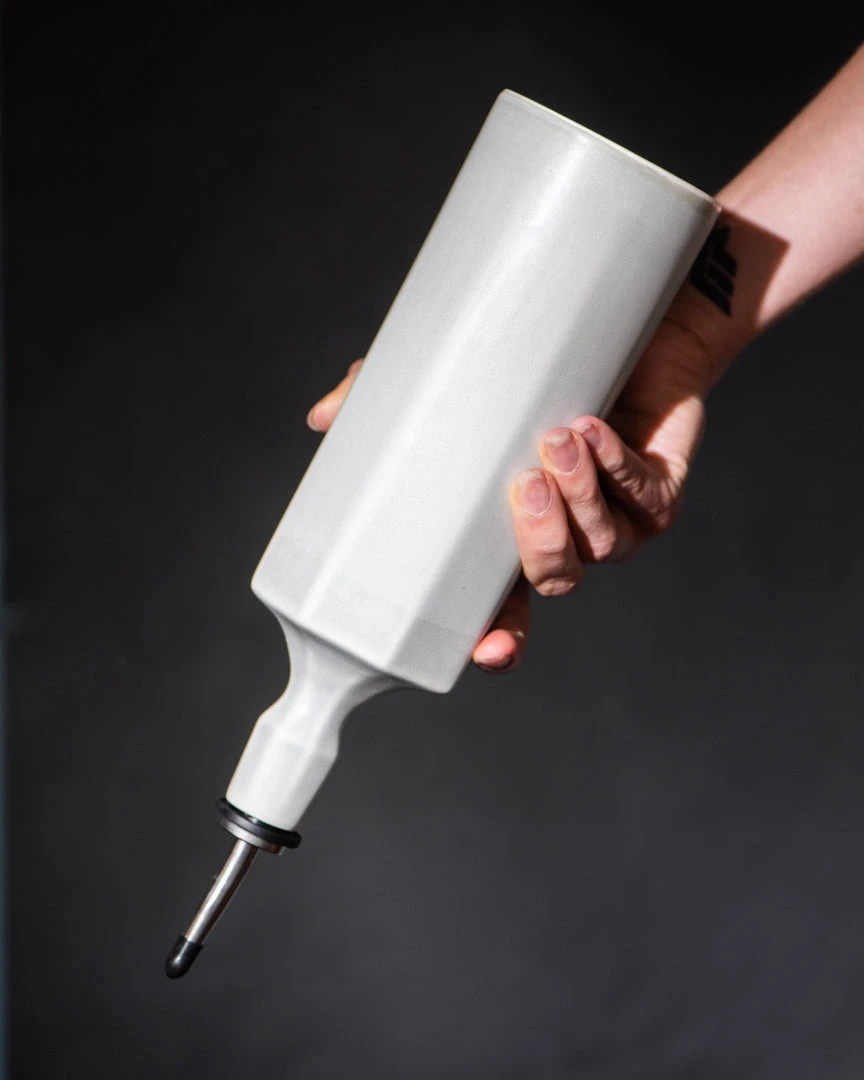 This modern handmade porcelain olive oil bottle is a versatile kitchen item. Use for olive oil, dish soap, bar drinks, and syrups.