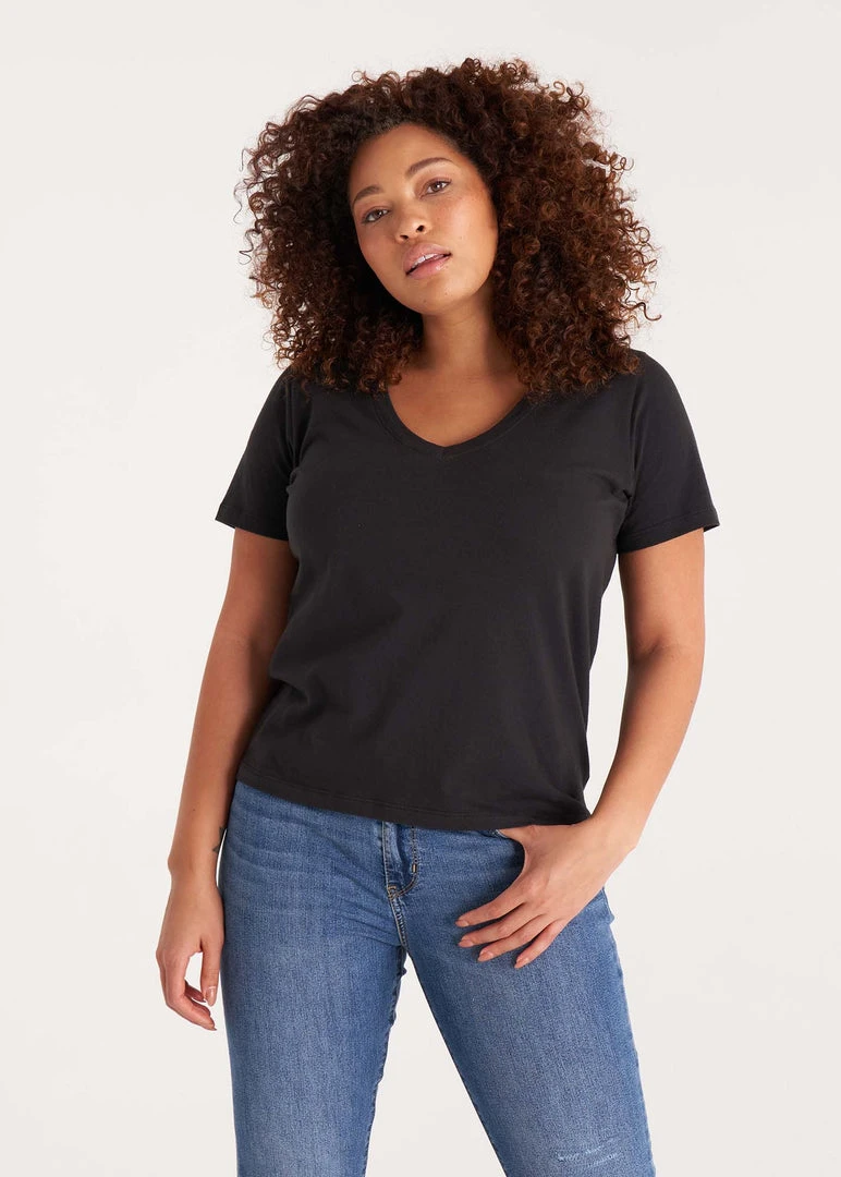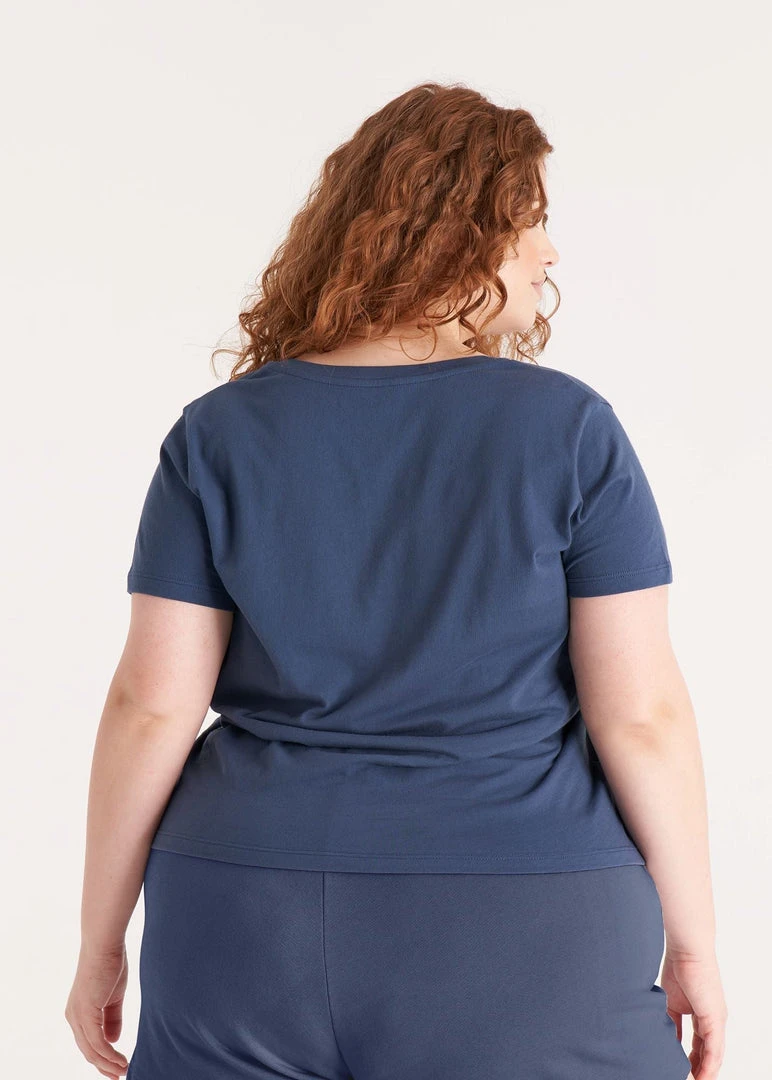 This modest V neck tee is a versatile wardrobe staple to be dressed up or down and take your outfits from season to season. Made with light weight organic and recycled cotton jersey, and dyed with non-toxic and low impact dyes.