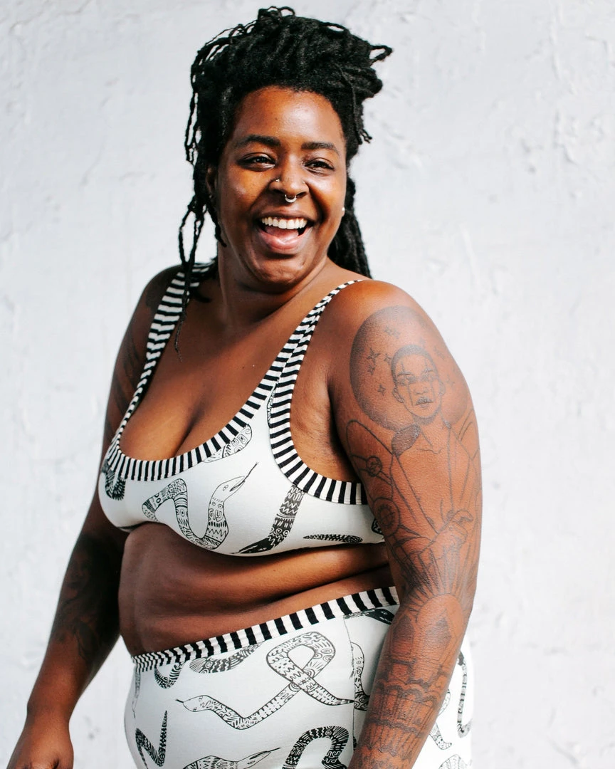 This spooky print is sure to give you the slithers. Beyond Halloween, you’ll be pleased to wear this bralette year round. With a piece of elastic sewn into the binding for extra support below the bust, the Sketchy Snakes Bralette is comfy, supportive, and solid, without feeling constraining or too bra-like.