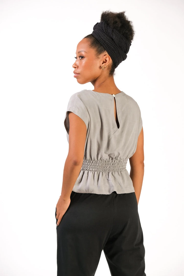 Offering femme summertime vibes with cinched waist and ruffled hem, this lightweight top is made using reclaimed rayon as part of tonlé’s sustainable zero waste process. Pair with your favorite bottoms and accessorize at will for easy breezy style.
