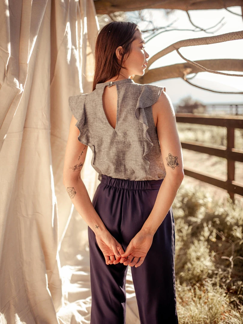 The Leang Hemp Top is a flirty and feminine sleeveless ruffle blouse. Featuring a high cut keyhole neckline, front and back flounce details, a slight crop and a mildly relaxed silhouette. The Leang Top is made with a hemp / tencel blend that is durable, breathable, blocks UV rays, wicks moisture and is hypoallergenic. This temperature regulating fabric makes the Leang Top comfortable year round.