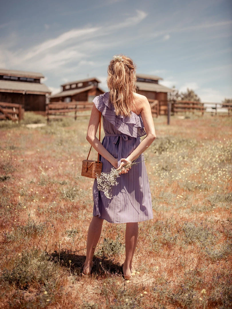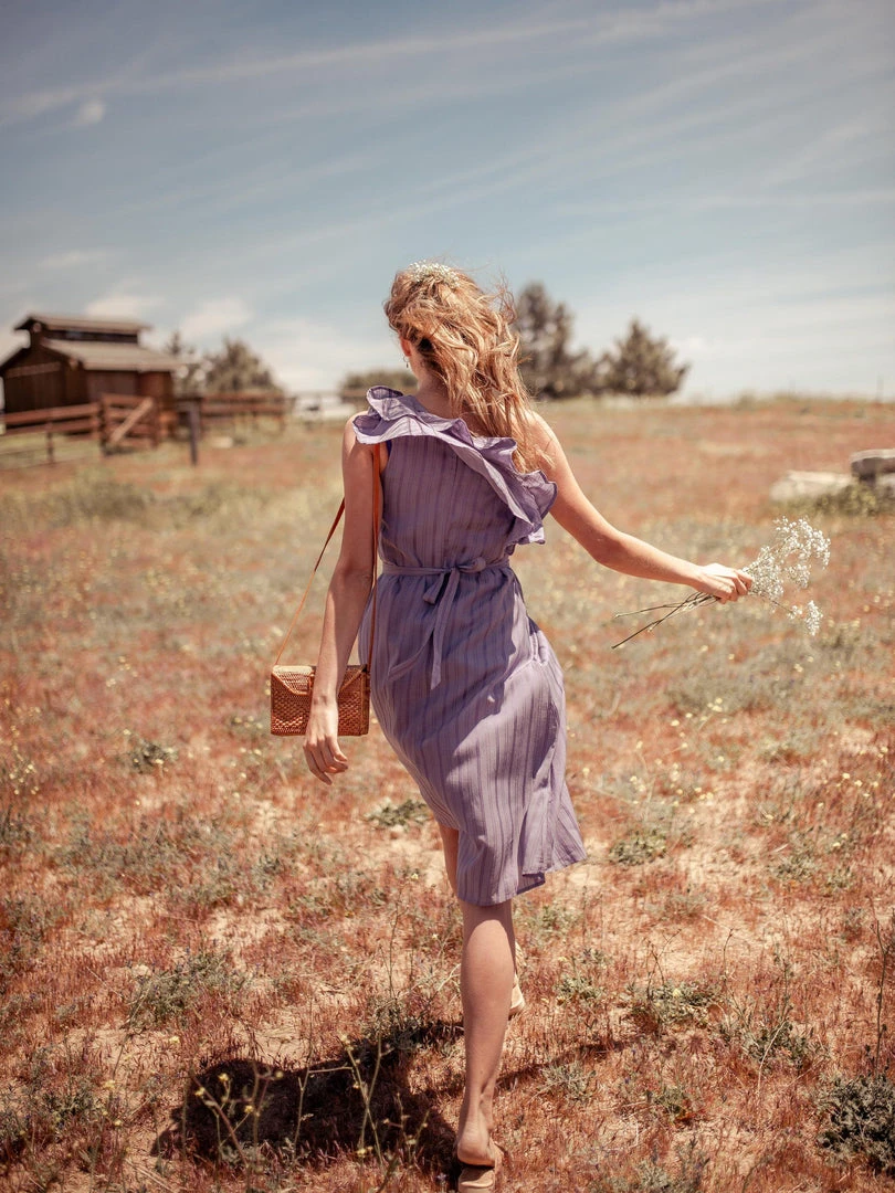 The Sokha Banana Midi Dress is sure to become your favorite sundress. Sokha is all about movement with a relaxed A-line silhouette, asymmetrical neckline, and double flounce ruffle detail. The optional tie at the waist lets you style it with both a strait and cinched waist. Sokha is made from banana viscose, a vegan alternative to silk that comes from discarded banana tree stems. This material is soft and breathable, keeping you cool throughout the warm months. Read about how banana fabric is made on Made Trade Magazine.