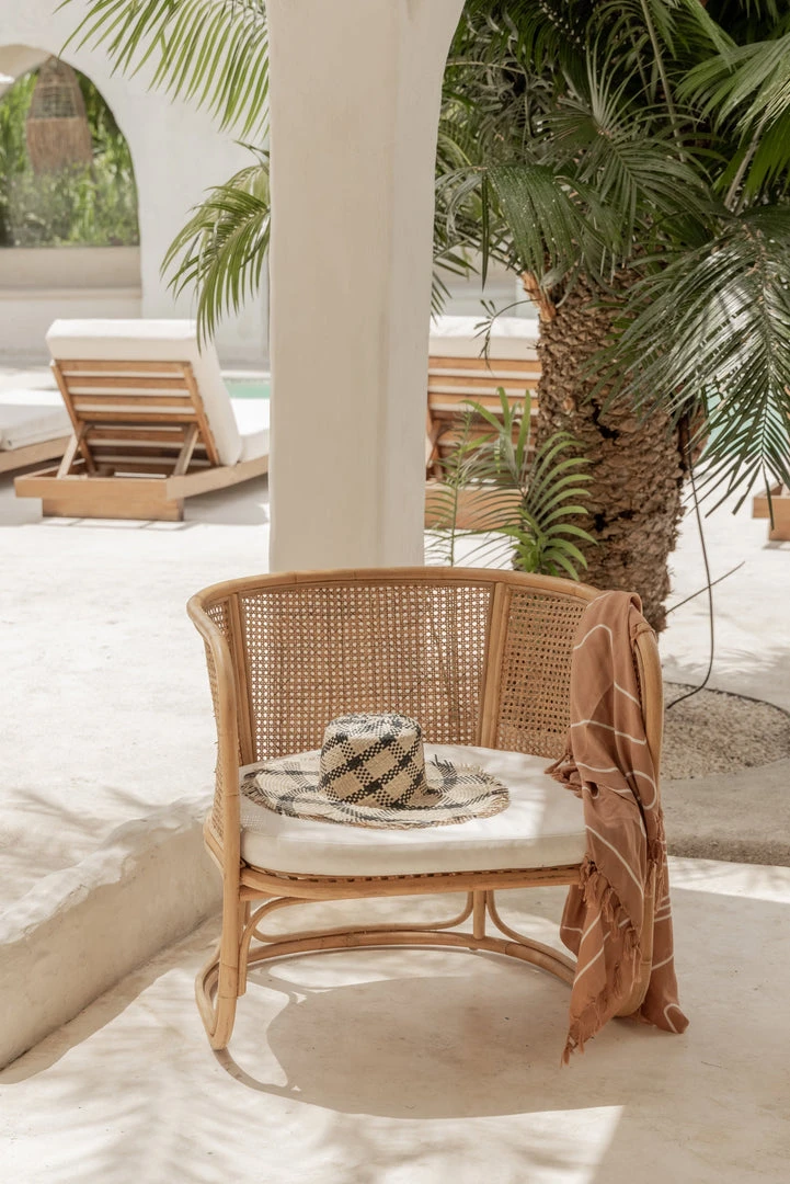 Keep the sun off your face and out of your eyes with this hand woven sun hat featuring an elegant plaid pattern and playful, frayed edge.