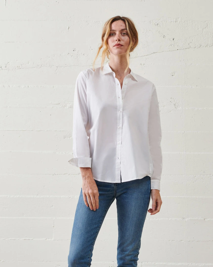 This classic button down shirt is a sustainable closet staple suited for building every capsule collection. Constructed from crisp organic cotton poplin, this icon thrives from desk to dinner. With a slim collar, inverted pleat detail, and natural shell buttons, this tailored shirt will elevate any outfit.