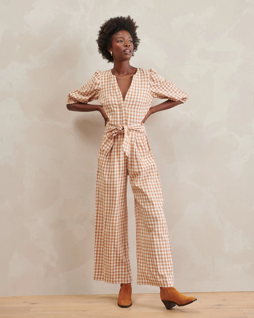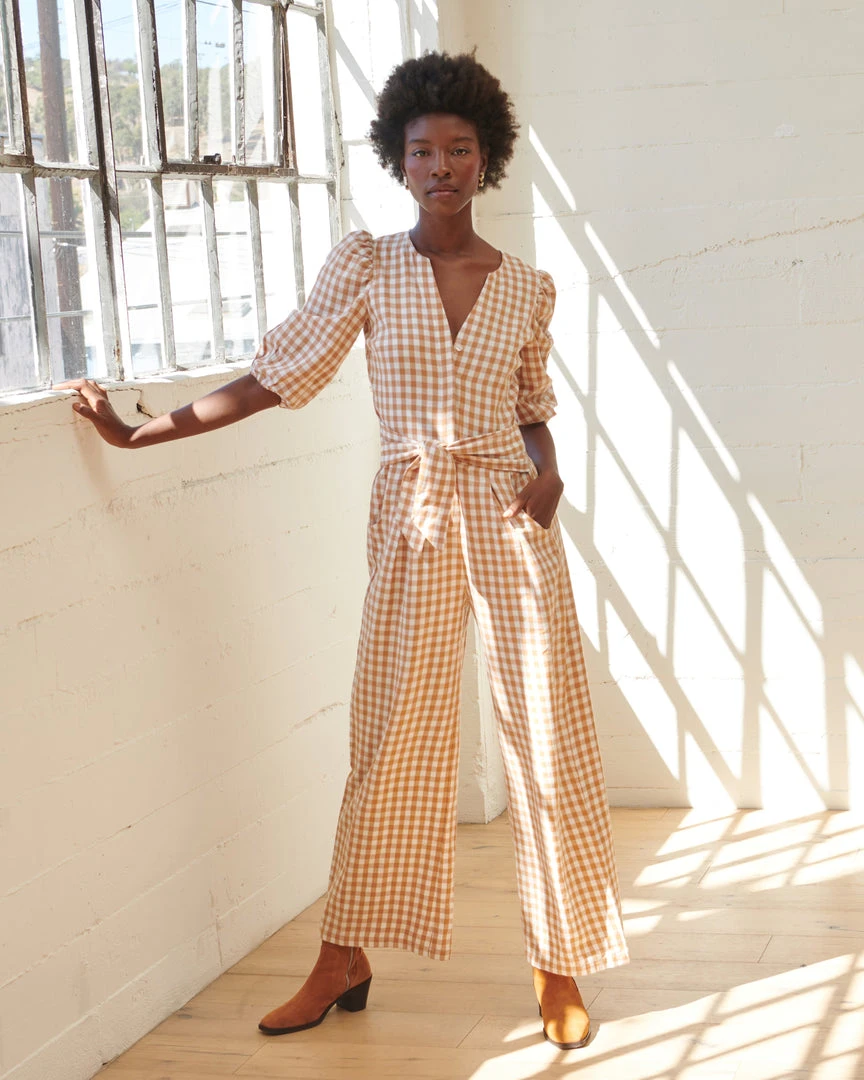 The Amber jumpsuit is a breezy Gingham jumpsuit with clean lines a sleek details, featuring a front tie belt at the waist and subtle feminine puff-sleeve detailing. Made of ultra-fine 100% organic cotton — a minimalist design with maximum effect.