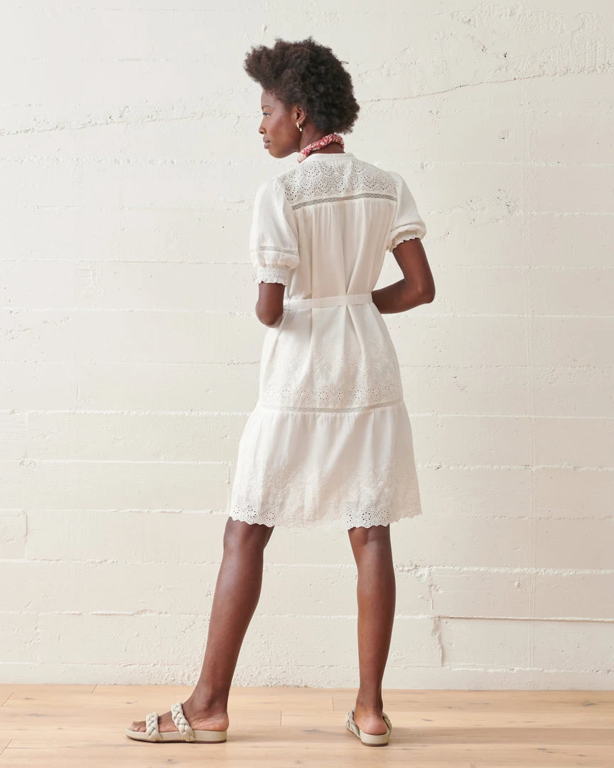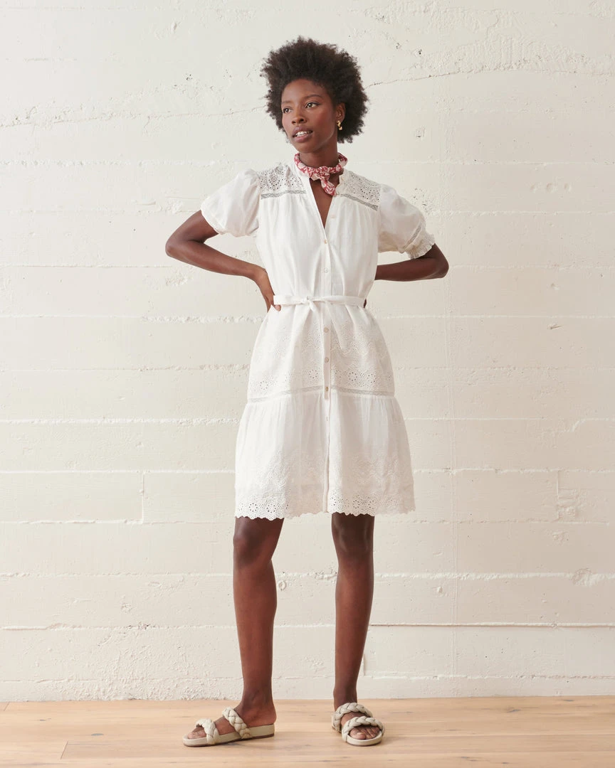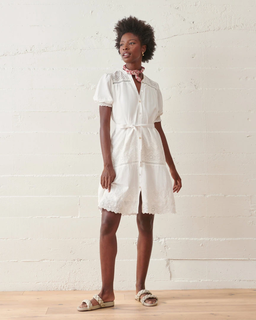 This dress gracefully falls just below the knee with a delicately belted waist and elastic shirring at the cuffs, creating a charming billowed effect. Crafted from clean, crisp, organic cotton, this is a lightweight timeless spring to summer piece with delicate eyelet details.