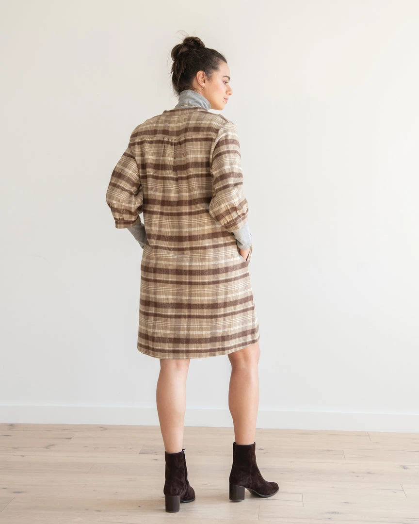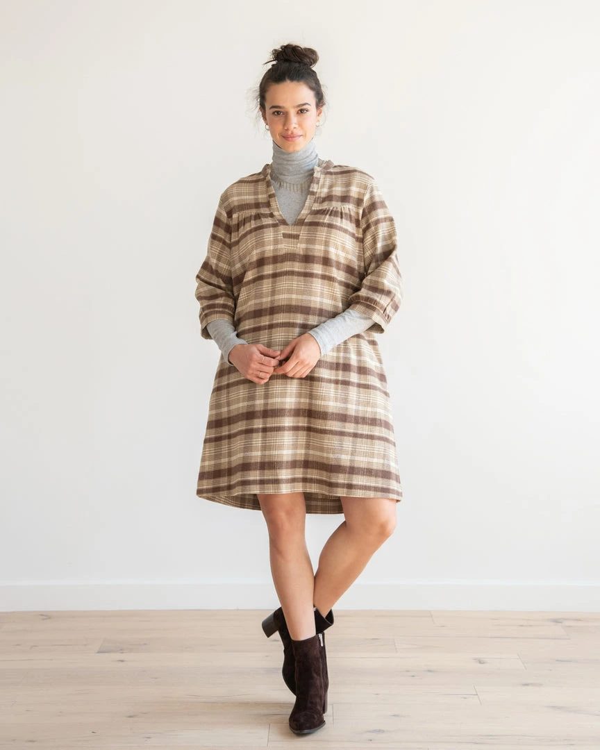 A clean palette of warm neutrals with an earthy plaid print, this carefree shift dress features a notched v-neckline and dainty puckering along the collar and at the sleeves. A statement in simplicity that will take you from season to season.