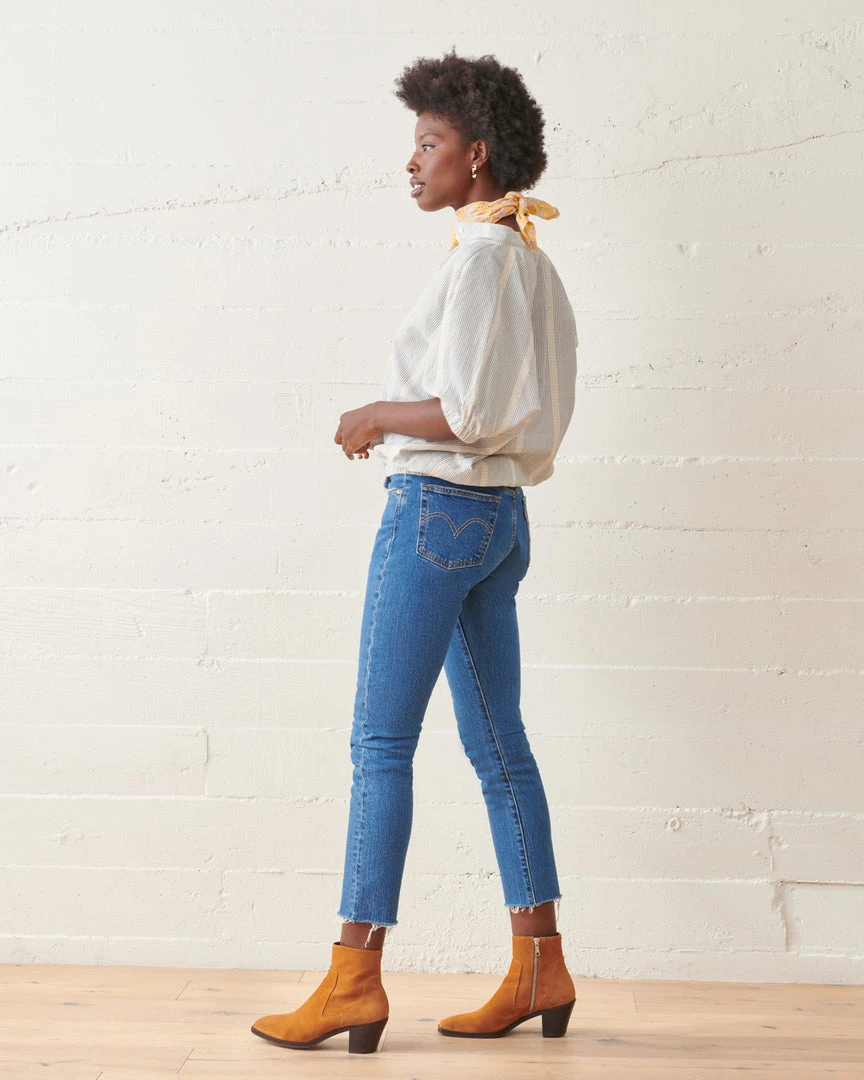 The Luca Striped Top exudes easy, chic style. Featuring a balanced blend of fitted and flowy, a cropped elastic waist and cuffs forms a subtle romantic billowing effect. Crafted from lightweight organic cotton jacquard stripe and finished with delicate shell buttons.