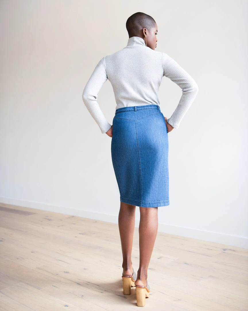 The Nash Skirt is made with durable, dependable denim in a medium wash with brass button-down front details keep this quintessential current. Style with the Classic Turtleneck.