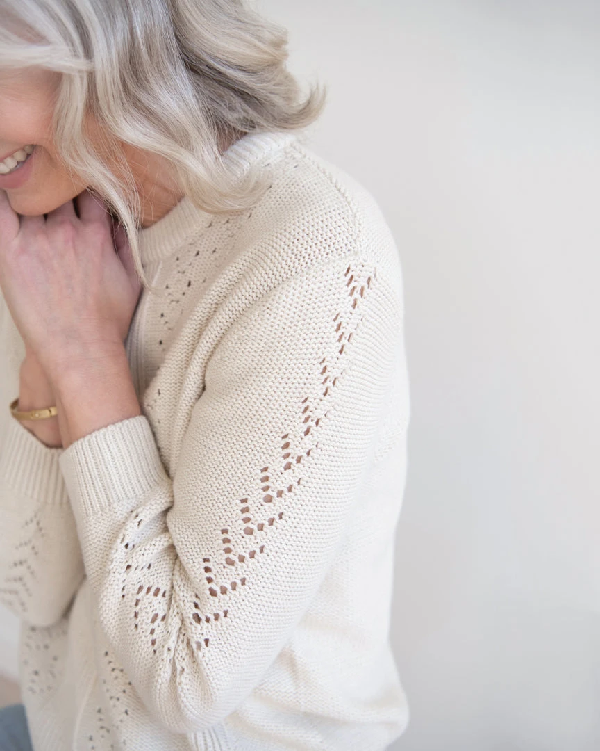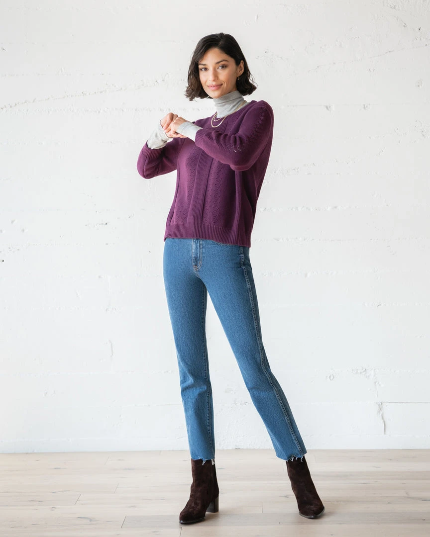 Make room for a little romance in your closet with our Pointelle Sweater. A coy, coquettish pullover with a hint of retro charm. Lacy eyelet needlework accents the front bodice and sleeves, all knit from a cozy wool and cotton blend. A great piece to layer.