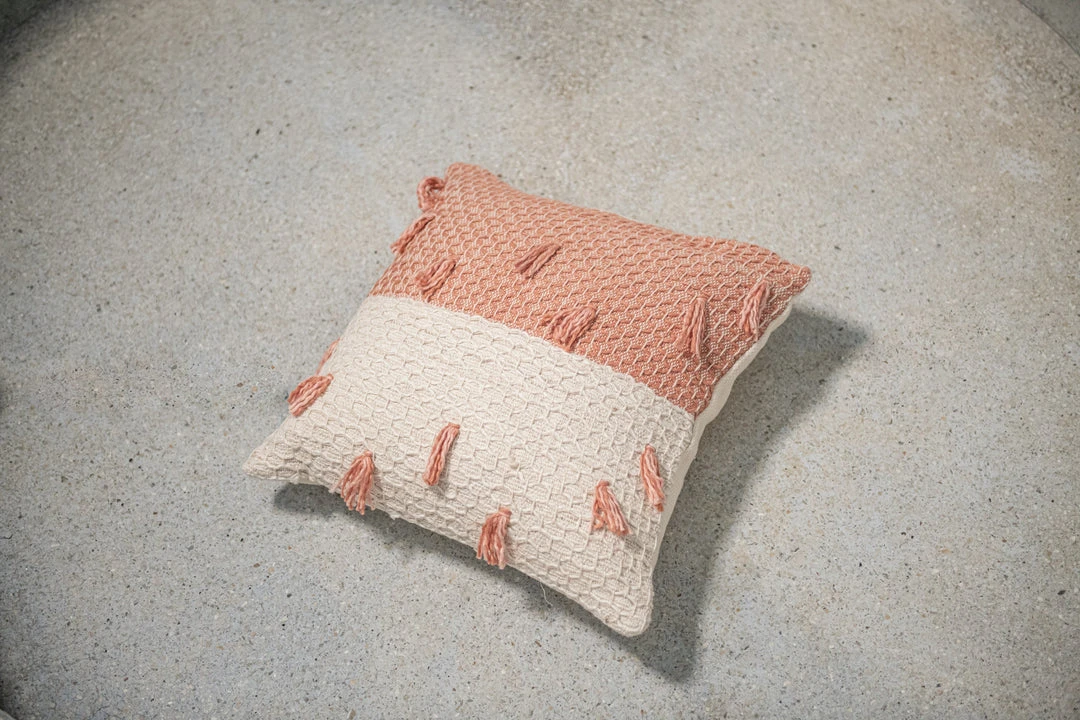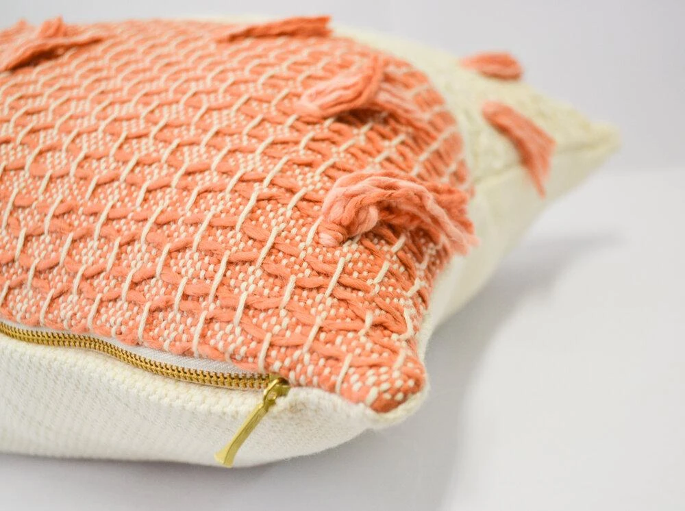 This diamond weave tasseled guayaba pink pillow is a fun way to add that extra touch to an all white bed or any neutral space in need of a pop of color and texture. This item features a new weave of small beautiful diamonds with a few hanging tassels for an added touch of playfulness.